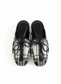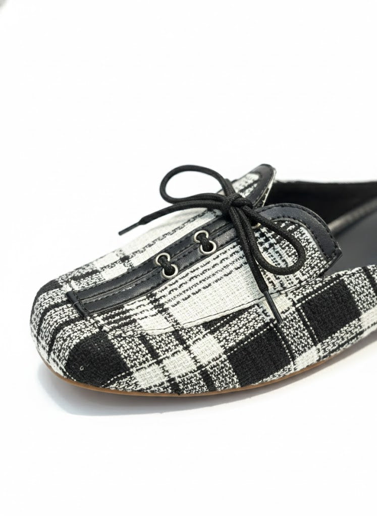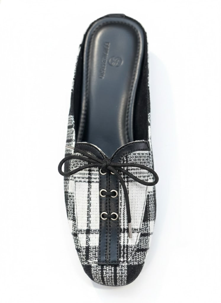 Elevate your daily rotation with a sophisticated blend of classic patterns and modern silhouettes. These mules feature a striking black and white plaid weave, offering a tactile, high-quality finish that bridges the gap between cozy and chic.