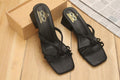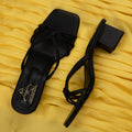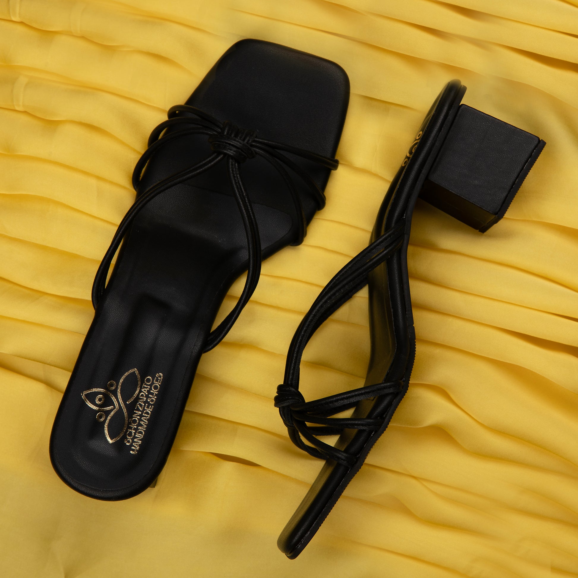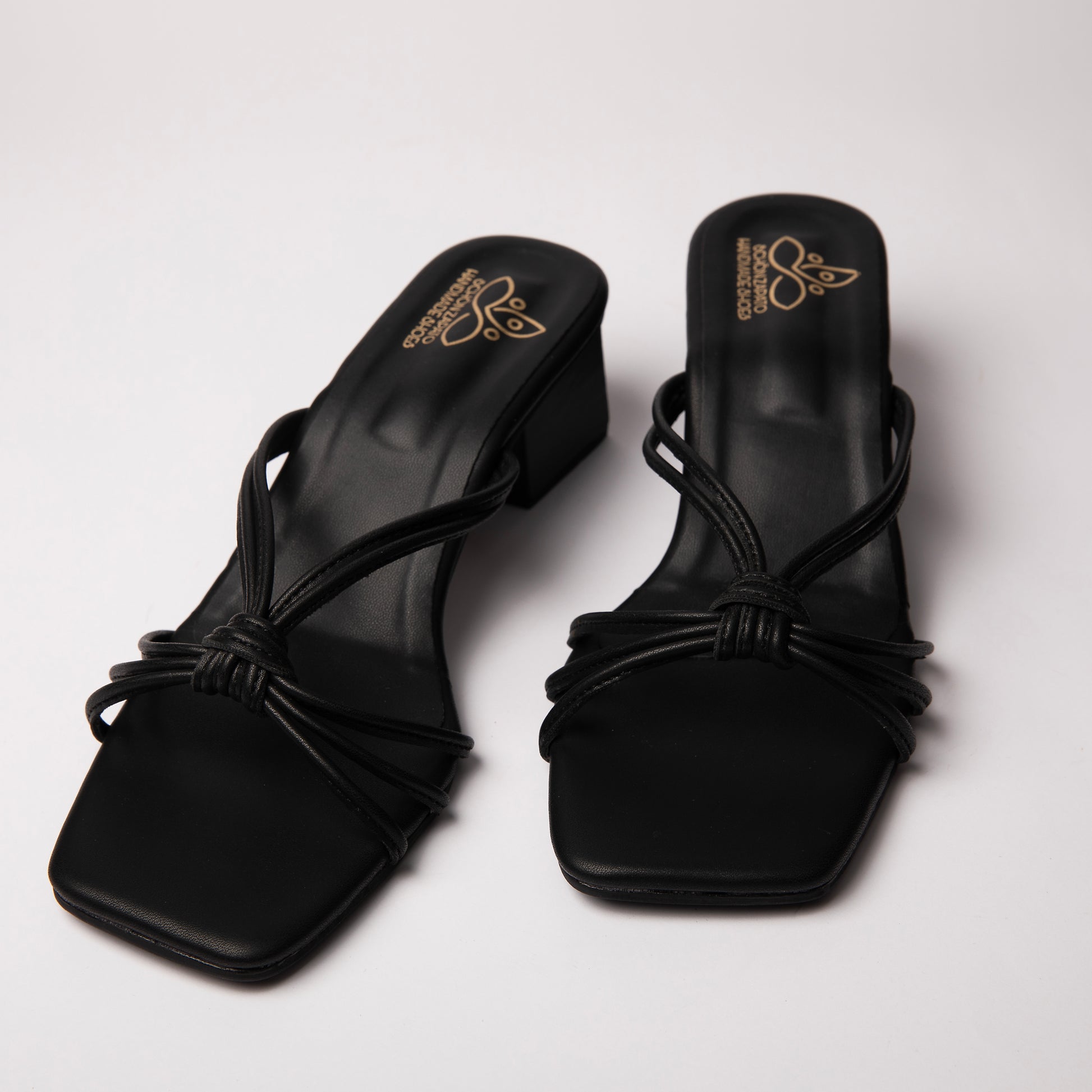 Strappy heels are elegant shoes with a 2-inch heel. They have thin straps that intertwine and tie together to form a small knot in the center of the upper part of the shoe. This delicate design is available in black, offering a versatile option for different outfits and occasion.