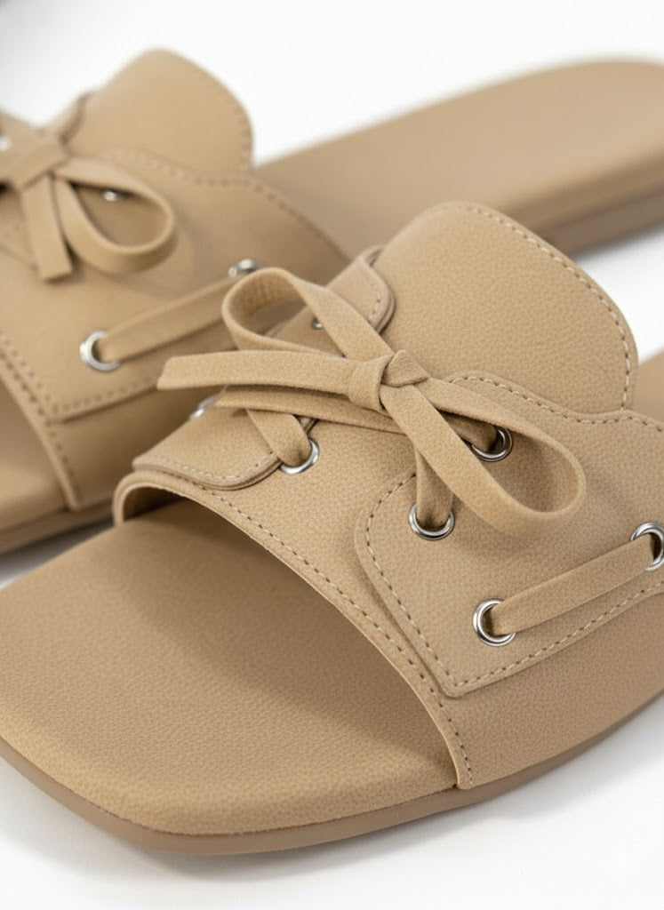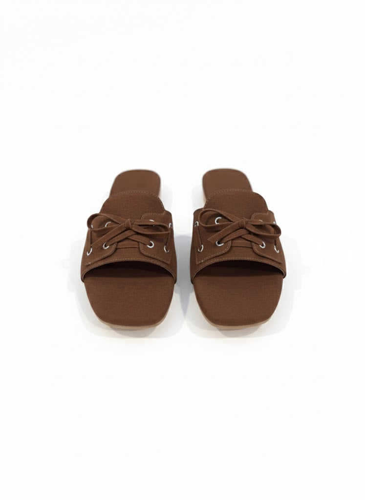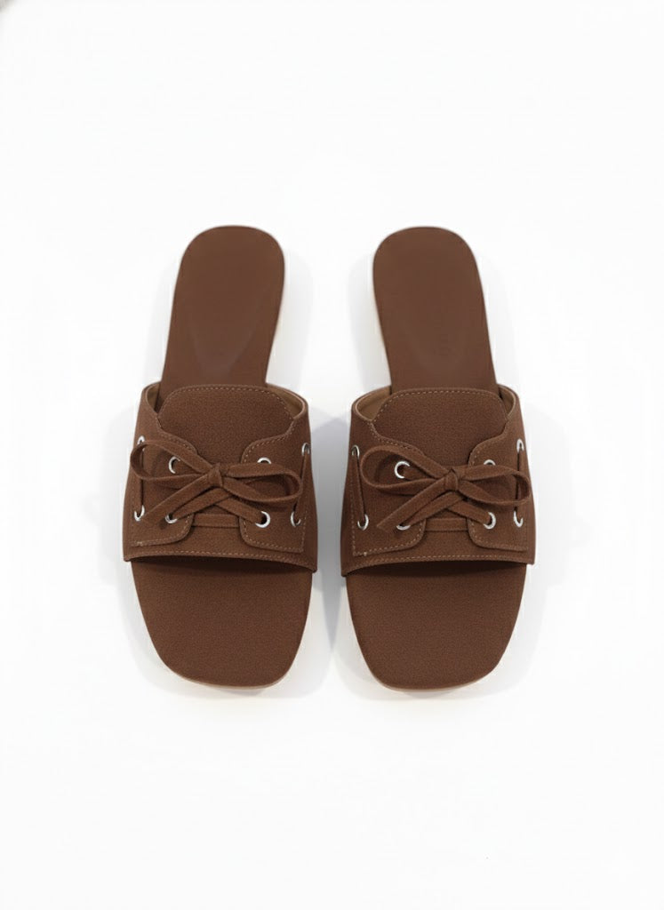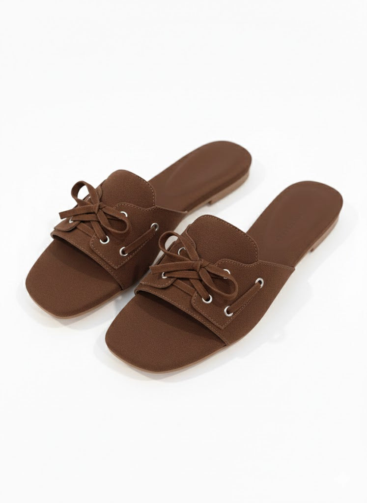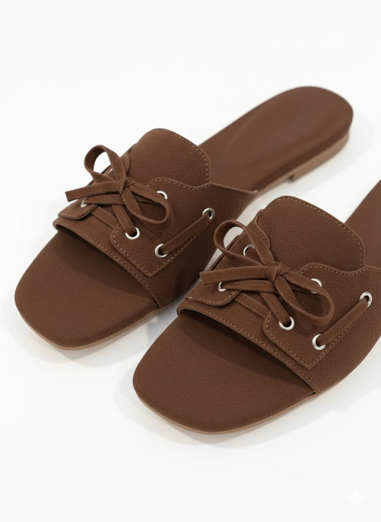 These brown and beige slide flats come with a shoe-style tie-up detail on top, giving them a unique and stylish look. Made with a soft suede-finish upper, they feel comfortable and easy to wear. The cushioned sole supports all-day use without discomfort. Simple to slip on and easy to pair with casual or dressy outfits