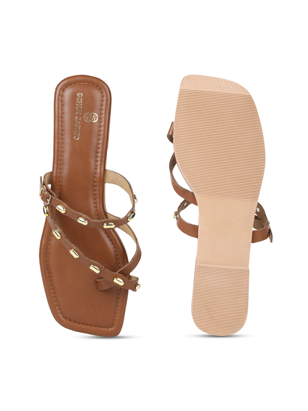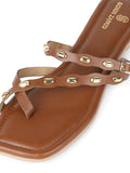Step into everyday elegance with our Tan Rivet Flats . Designed in a rich tan shade that pairs with everything, the gold studded straps add just the right amount of glam while keeping it classy. The double-strap design holds your feet perfectly, and the cushioned sole makes every step feel soft and easy.